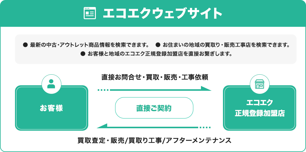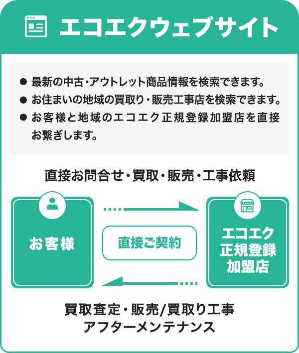 当ウェブサイトは、中古エクステリア商品の買取または、ご購入をご希望のお客様と、地域の中古エクステリアを取扱い可能なエクステリア工事店様を直接つなぐマッチングサイトです。お問い合わせからご契約、工事まですべて最寄りのエコエク登録加盟店と直接おこなっていただきますようお願いいたします。