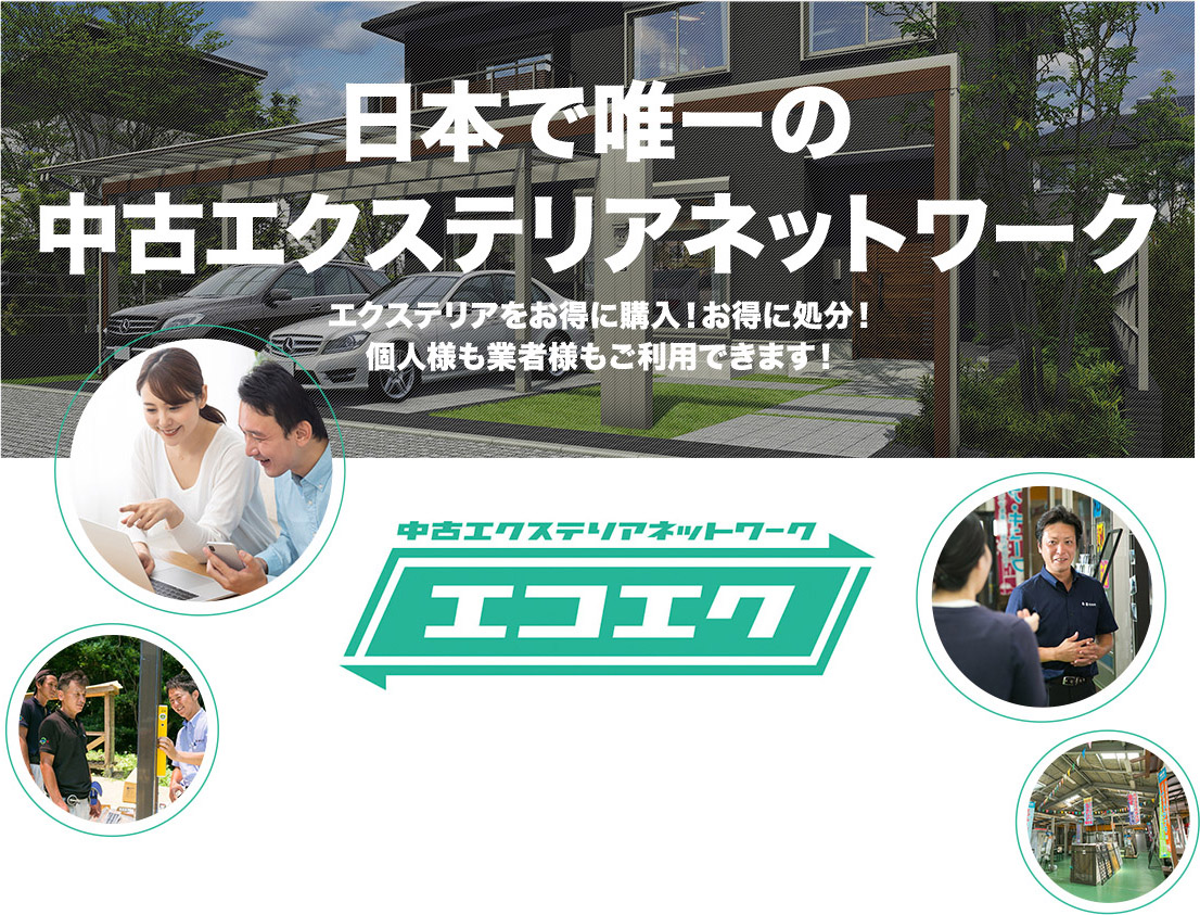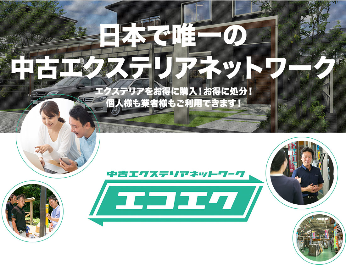 エコエクとは、一度使用したカーポートやフェンスといったエクステリアの中古品やアウトレット品の買取り、解体、販売、再設置工事までを一貫して行うことのできるエコエクステリア工事店のネットワークです。